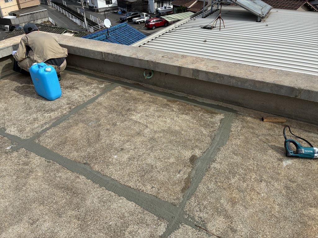 本日は自社物件のリノベール王子で屋上防水作業を行っております。