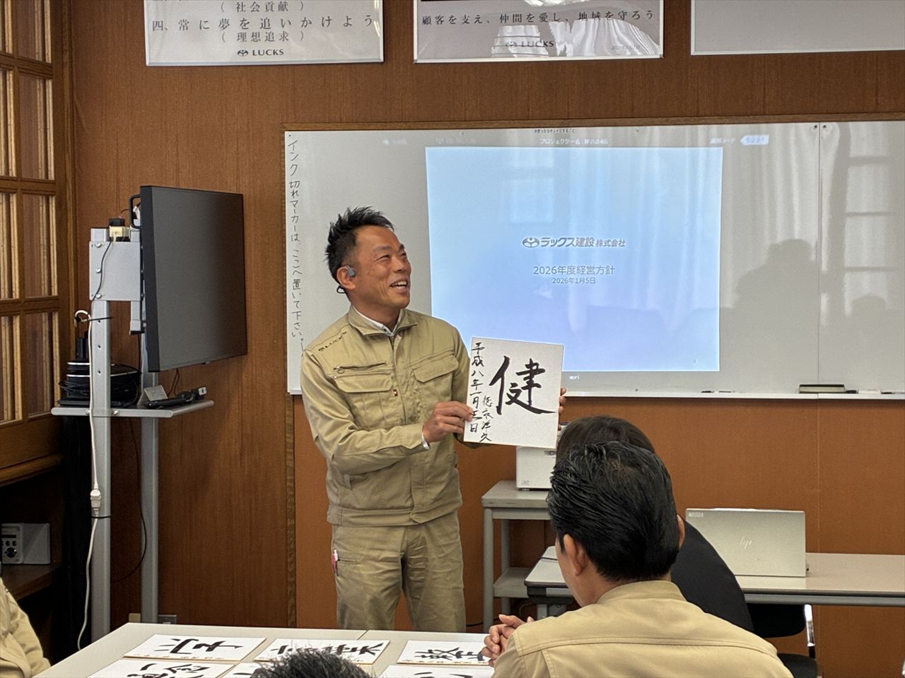 また、工事部と管理部の部長は、偶然にも同じ四字熟語【一念通天】(強い新年をもって努力すれば、どんなことでも成し遂げられるという意味)と書いており、皆を驚かせました。