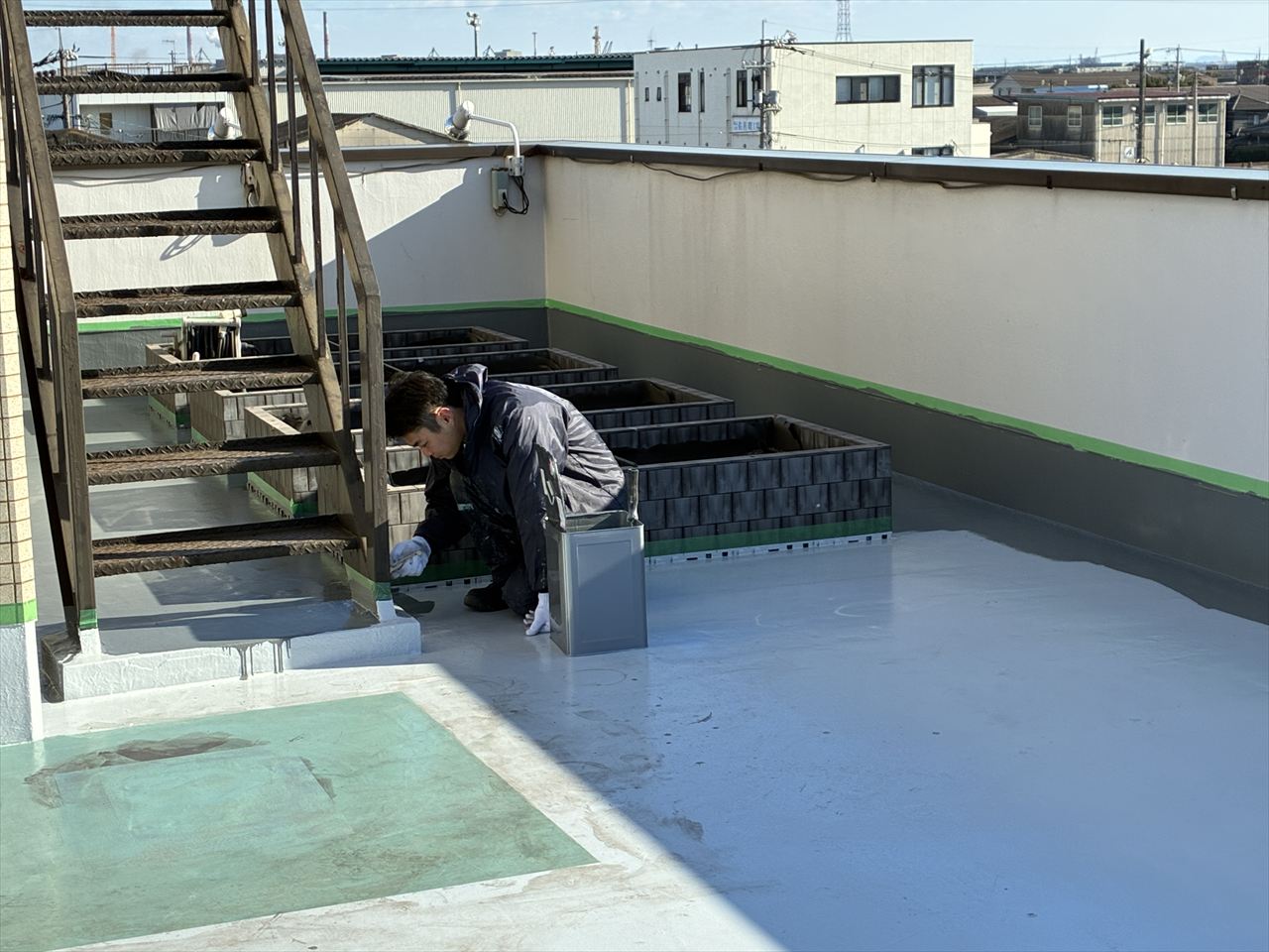 臭いに導かれて屋上に上がってみると、工事部の西村と周川がトップコートを塗ってるところでした。