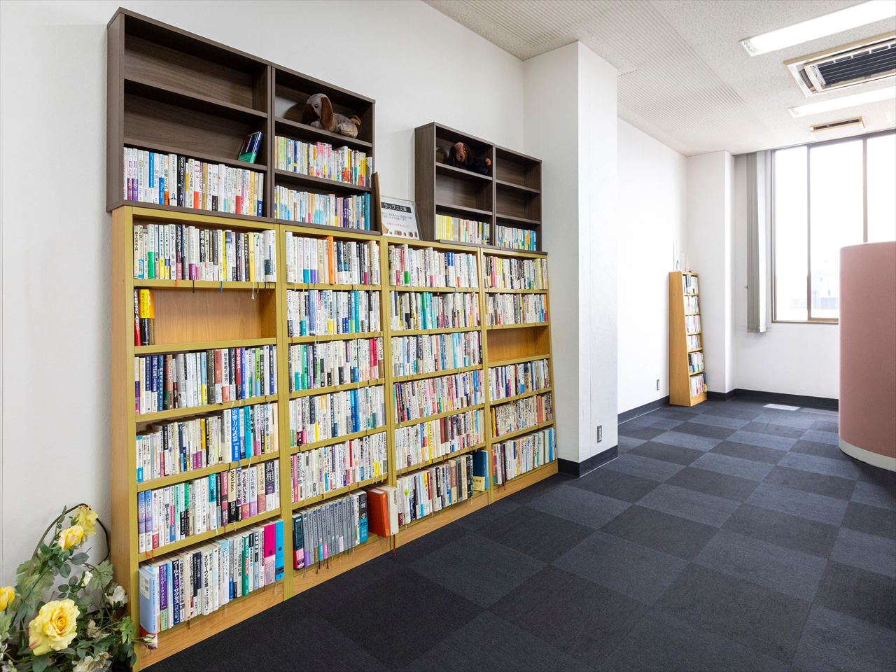 先月末、本社2Fロビーの壁をクロス→塗装へ替えたのを機に、据え置き型本棚→壁面本棚へ変更されました。