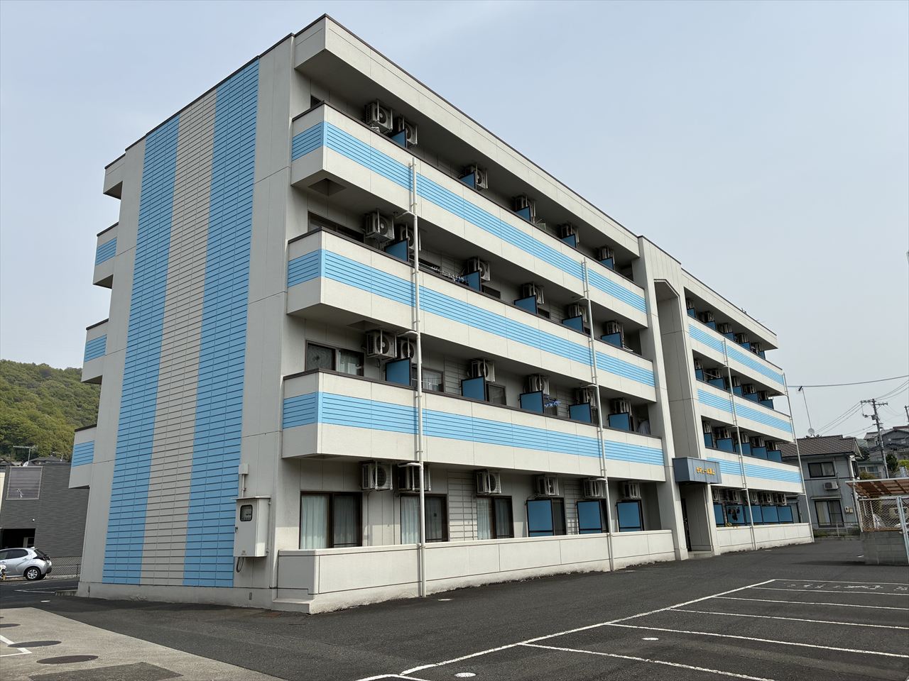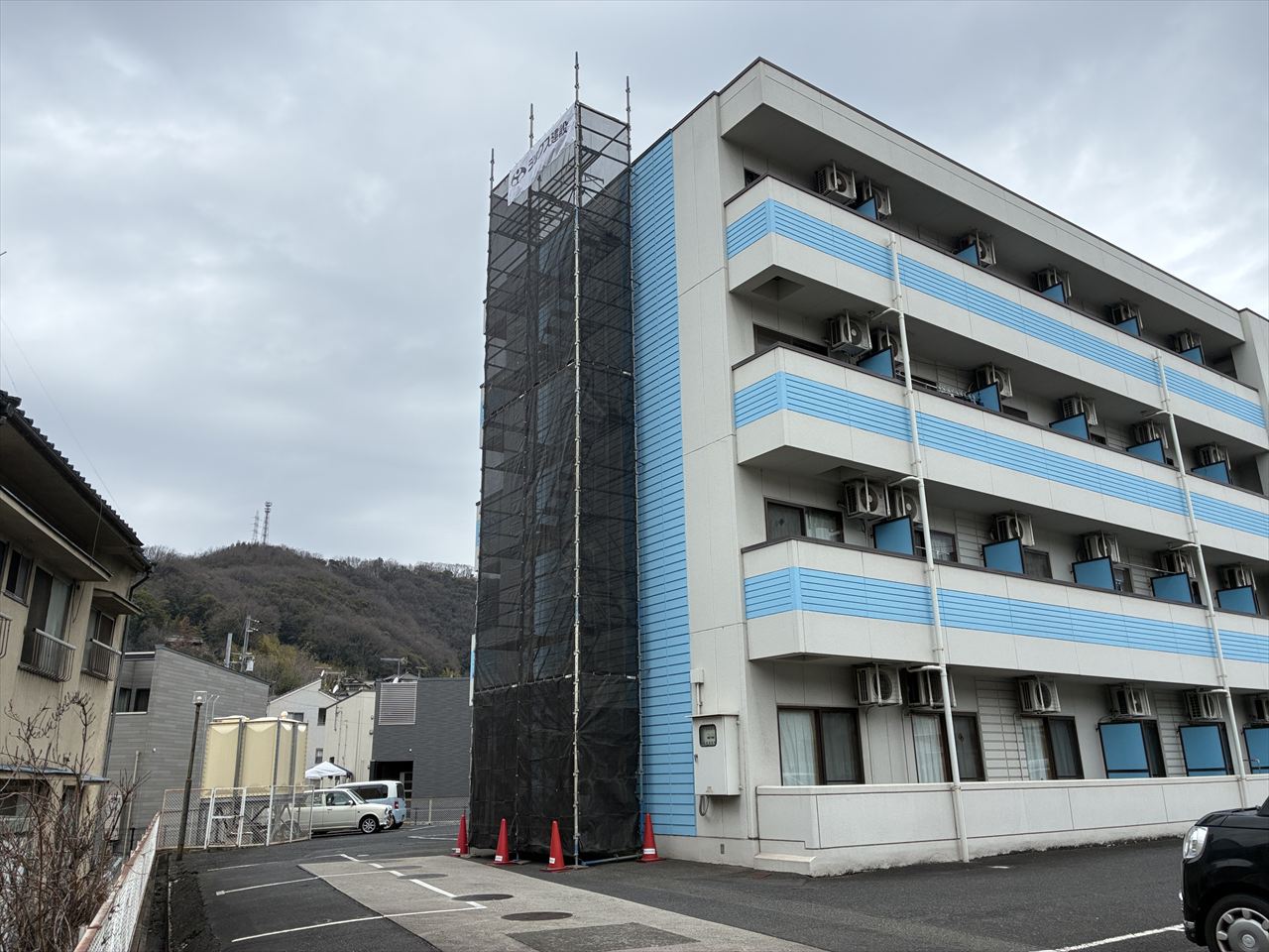 福山市内にある、地上4階建てのアパートの屋上防水工事を行うべく、
